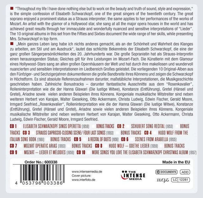 Elisabeth Schwarzkopf est une musicienne et soprano allemande, naturalisée britannique, née le 9 décembre 1915 à Jarotschin et morte le 3 août 2006 à Schruns, en Autriche. Elle est l'une des grandes sopranos du XX siècle.